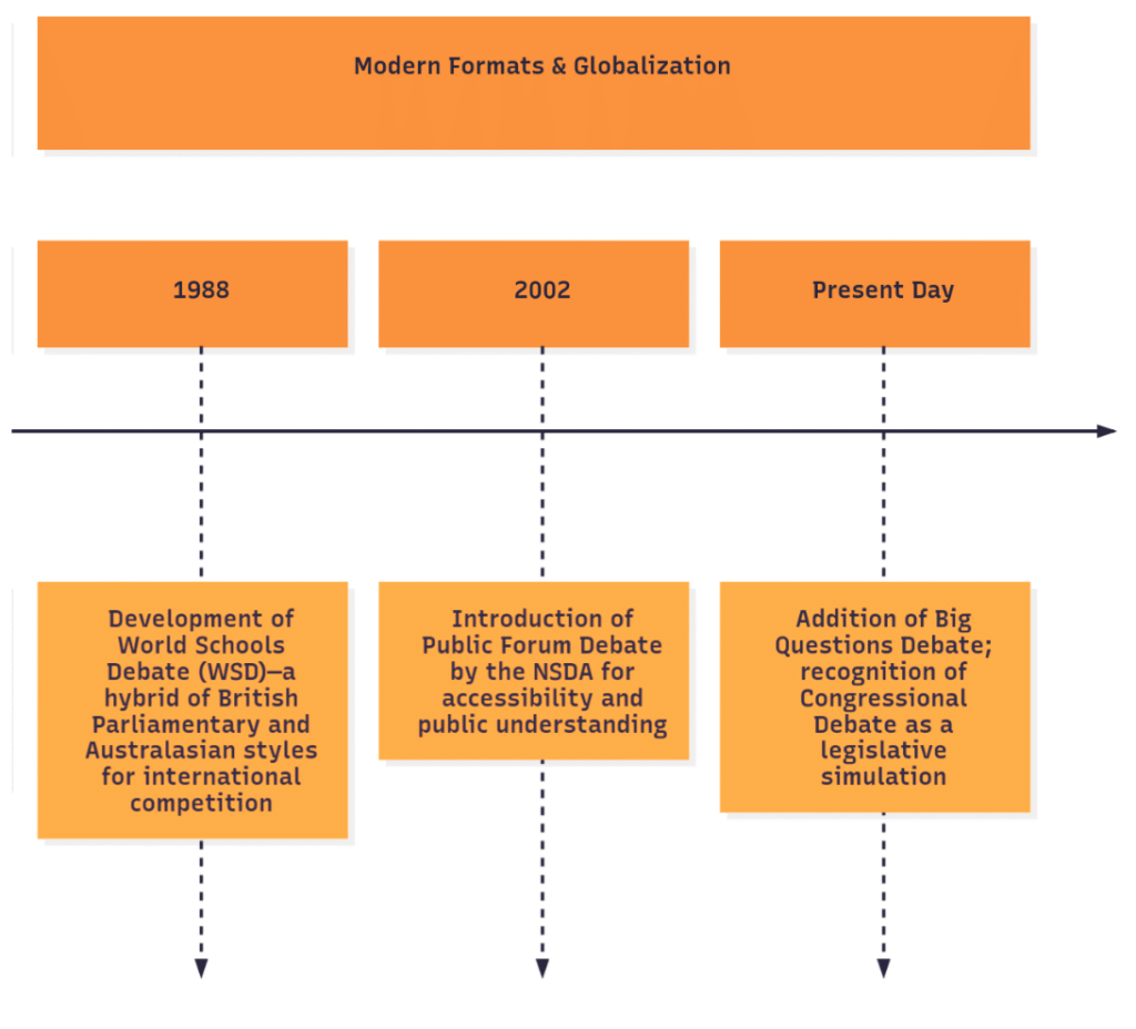 這些基礎為後來的當代賽制鋪路。1970 年代,林肯–道格拉斯辯論(Lincoln-Douglas Debate, LD)出現,專注於價值與哲學的探討。1988 年,世界中學式辯論(World Schools Style Debate, WSD) 誕生,融合各國比賽風格。WSD 的特色之一是引入 質詢點(Points of Information, POI),讓台上攻防不再只是單方面演說,而是在演講過程中加入短暫插話,增加了臨場互動和張力。