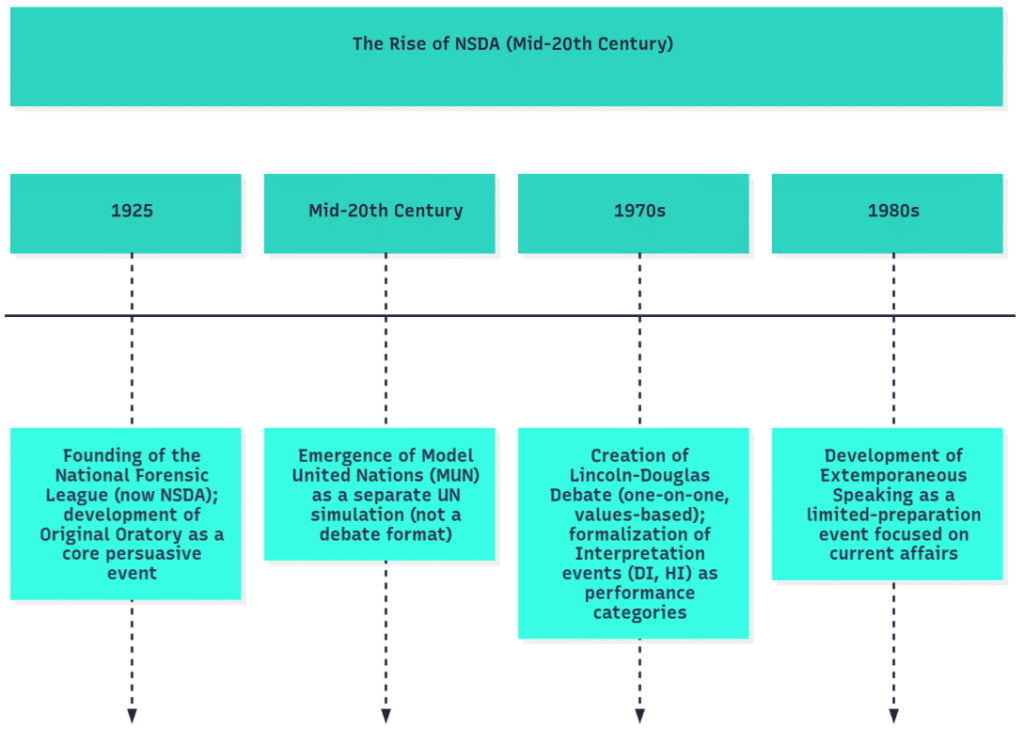 二十世紀中期,辯論與演講的樣貌開始更多元。詮釋類比賽(Interpretation Events)強調表演和故事演繹,即席演講(Extemp)考驗參賽者短時間內整合資訊、清楚表達的能力。而隨著二戰後國際局勢的變化,模擬聯合國(MUN)逐漸盛行,學生化身各國代表,透過談判與協商模擬真實的外交場合。這也告訴我們:辯論並非單一形式,而是可以回應社會需求,發展出不同樣貌。對學生來說,這象徵語言不只是辯論,也能成為表演、即興與國際交流的工具。