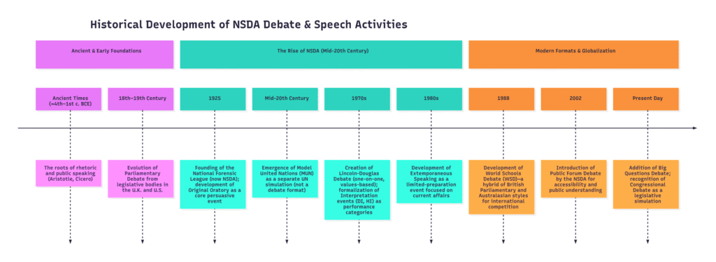 隨著時代推進,這股傳統走進十八、十九世紀的議會殿堂,並逐漸發展成更嚴謹的議會式辯論(Parliamentary Debate),由此揭開近代辯論的序幕。1925 年,美國成立了全美演講與辯論聯盟(NSDA),這是一個劃時代的轉折點。當時的比賽以政策辯論(Policy Debate)為主,學生得花上一整年研究一個政策議題,完整準備正反雙方的論點。而原創演說(Original Oratory)則很快成為經典項目,讓演講不只是技巧,更是展現自我思辨和風格的舞台。對今天的學生來說,這些制度化的設計,正是我們現在各種辯論比賽的起點。這提醒家長:有系統的比賽能讓孩子學到「研究、準備、表達」的完整流程。